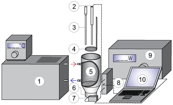 Experimental set-up for the ultrasonic processing of fluids: 1—thermostat; 2—hydrophone; 3—thermometer; 4—foil with holder; 5—temperature-controlled reactor; 6—piezoceramic ultrasonic transducer; 7—current transformer; 8—digital oscilloscope; 9—laboratory generator UZG-22; 10—personal computer; arrows show water circulation.