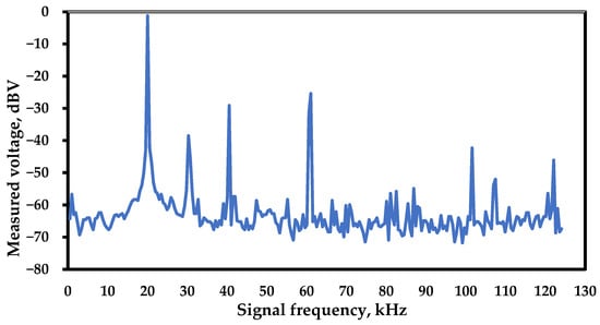 The amplitude was regulated by adjusting the power of the generator (9). The frequency of the applied signals was detected through the use of a transformer (7). The acoustic signal frequency was also monitored using a hydrophone (2). A digital oscilloscope (8) connected to a computer (10) was used to receive the signals. To determine the erosive capability, a foil with a holder (4) was immersed in the reactor (5). The cavity erosion was evaluated by using aluminum foil (4) that had been immersed in the reactor filled with crude oil. The frequency of the main harmonics of the applied signal was 20 kHz, and its spectrum is presented in Figure 5.