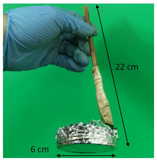 The aluminum foil within the holder was designed (Figure 6) to evaluate the cavitation erosion intensity. The holder consisted of a plastic ring and a handle. The aluminum foil was evenly stretched over the ring. The smooth surface of the foil was used to prevent the accumulation of the evolved gases under it. The gases can behave like a buffer that prevents contact between the liquid and the foil.