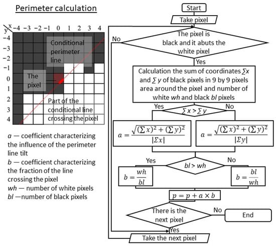 The measurement of acoustic spectra with hydrophones and cavitation erosion evaluation with aluminum foil were carried out separately. Deformation of the foil after cavitation erosion was photographed using a high-resolution camera (1920 × 1280 pixels). “ImageJ 1.54d” software was used to estimate the area of the deformation within the foil based on the number of “black” and “white” pixels. However, to estimate the perimeters of the deformed pit-like zones of foil, the given and other standard approaches are not applicable because of the complexity of the shapes, such as the presence of many closed worn areas and the unevenness of the wear lines. Therefore, through using Microsoft Excel’s Visual Basic for Applications (VBA), we developed an algorithm that could estimate the perimeter of the erosion pits based on the number of boundary pixels between the dark and light areas and the application of coefficients that take into account the angle of the boundary line and the length of the line passing through this pixel (Figure 7). Such a modification allowed for more precise perimeter calculations for the complex shapes. The developed algorithm was tested on the ideal spere perimeter, and the standard deviation factor did not exceed 2%.