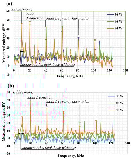 The subharmonic of the fundamental frequency at 10 kHz, which is associated with the oscillation of cavitating bubbles in water larger than the resonance size, is particularly important for analysis [76]. The magnitude of this peak increases significantly, with a slight increase in the fundamental frequency and with increasing ultrasound intensity. The slower growth in the main frequency is attributed to the presence of large bubbles in the liquid, which prevent ultrasound propagation in the liquid and dampen the acoustic signal. Additionally, the growth of bubbles in cavitating liquid is specifically related to the main frequency, which reduces wave energy [76].