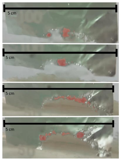 The sonication process in liquid medium is accompanied by the formation of the local areas with intensive cavitation erosion. The local intensive cavitation areas were generally observed near heterogeneous materials, likely due the presence of cavitation nuclei near them (Figure 9). The local intensive cavitation area can be concentrated at a point, multiple points, or extended in a line along the solid material. Figure 9 presents the intensity of the local cavitation areas on the aluminum foil immersed in the water phase. The cavitation area is easy to observe due to the presence of aluminum particles, and for contrast, they are highlighted in red in Figure 9.