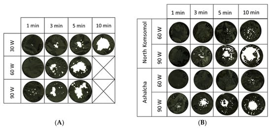 Visual depictions of the cavitation erosion of aluminum foil (with a thickness of 20 μm) immersed in the water depending on the sonication time and power are provided in Figure 10. Subjecting the aluminum foil to sonication for 10 min under 60 W and 90 W totally damaged the foil. On the other hand, the cavitation erosion induced under 30 W sonication had no damaging or erosive effect on the aluminum foil (the same aluminum foil immersed in the oil phase). This means that the energy required to collapse the cavitation bubbles in crude oil is much higher than that required for water. Therefore, we decided to use aluminum foil with a lower thickness (14 μm instead of 20 μm) in subsequent experiments to evaluate the intensity of the cavitation erosion in the oil samples.