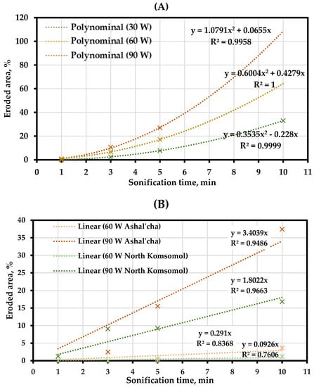According to the obtained results (see Figure 10), the cavitation erosion of both water and crude oil samples depends on the sonication time and power. The correlation between the erosion and sonication time for both the water and oil phases can be determined from viewing Figure 11. The dependency of the erosion in water phase from the sonication time has a polynomial behavior (R2 = 0.996), while the correlation between the erosion of crude oil and the sonication time is almost linearly proportional (R2 = 0.949). The latter curve’s behavior significantly eases the task of determining the intensity of cavitation.