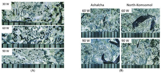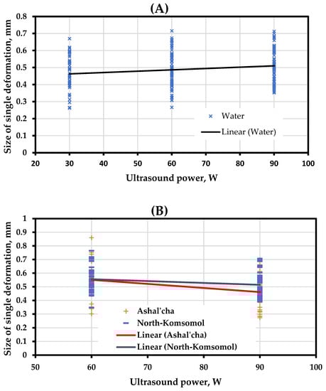 According to the obtained graphs, the size of the individual deformation sites varies widely, and they are almost independent from the power of the ultrasound. Thus, for water, the average size of the deformation sites increases slightly with increasing ultrasound power, but for oil, the inverse is true. It is noticeable that for the high-viscosity crude oil sample (Asha’lcha), the average size of the deformation sites decreases more than it does for the North Komsomol oil sample, and the decrease in the average value is 0.091 mm, while for North Komsomol oil, it is 0.042 mm.