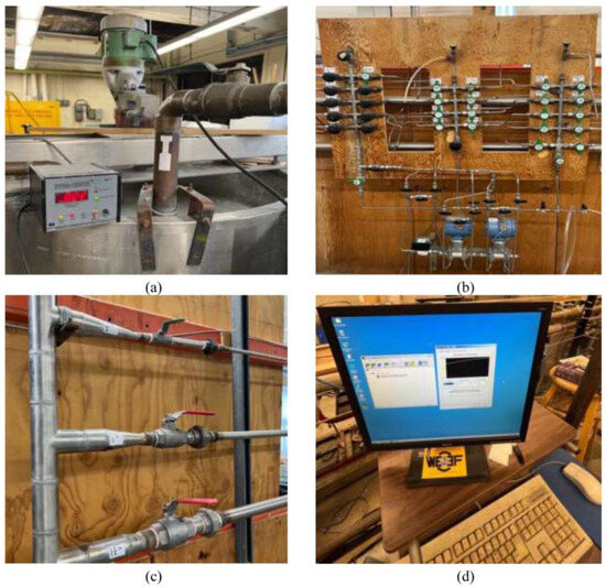 Images of different portions of the experimental flow loop: (a) mixing tank; (b) pressure drop measuring panel; (c) three different diameter pipeline test sections; (d) computer terminal of data acquisition system.