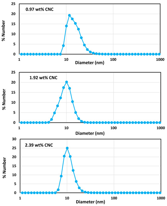 The size distribution of CNC suspension was determined via DLS using a Zetasizer Nano ZS90 with a He-Ne laser operating at 633 nm frequency. The dispersant (water) properties were specified at 25 °C as follows: viscosity = 0.8872 mPa.s; and refractive index = 1.330. For the CNCs, the refractive index specified was 1.51. This value of CNC refractive index was available in the software of the instrument and agrees with the value reported in the literature [25]. For each CNC concentration, three DLS measurements were made, and the average values were calculated. Figure 7 shows the size distributions of CNC suspensions at different CNC concentrations. The average hydrodynamic diameter of CNC at different concentrations is shown in Figure 8. The average hydrodynamic diameter of CNC (Figure 8) decreases with the increase in CNC concentration initially and then levels off at high concentrations (>1 wt%) to approximately 10 nm. The decrease in average hydrodynamic diameter of CNC is probably due to interaction of nanocrystals at high concentrations. Note that the CNC suspensions were subjected to intense shear in the pumping system of the flow loop before the DLS measurements were made.
