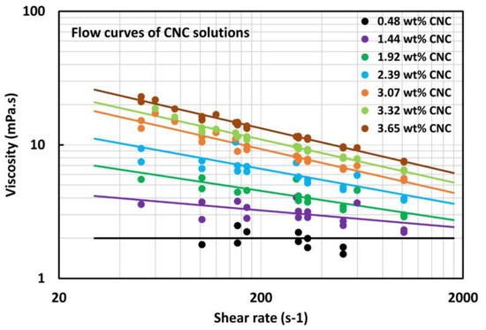 Viscosity vs. shear-rate plots of CNC suspensions at different CNC concentrations.