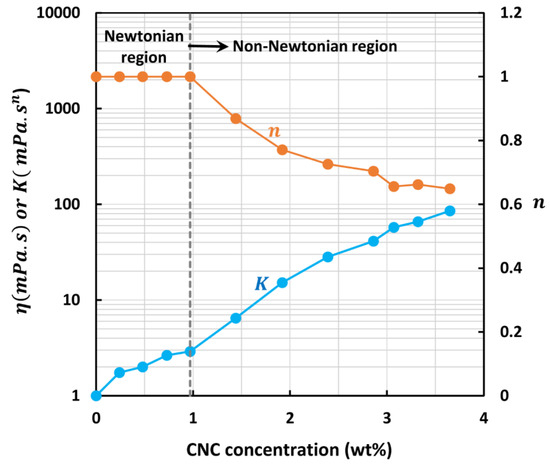 Figure 10 shows the plots of power-law constants ( and ) as a function of CNC concentration. The CNC suspensions are Newtonian (at CNC concentrations below 1 wt%. At higher concentrations, the CNC suspensions are shear-thinning and the flow behavior index decreases with the increase in CNC concentration. The consistency index () increases with the increase in CNC concentration.
