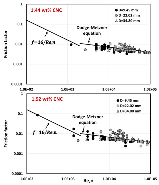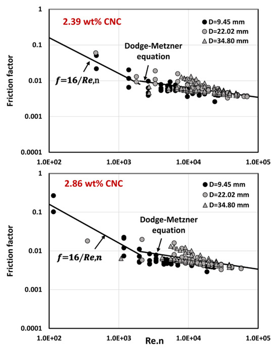 The pipeline experimental data for CNC suspensions obtained from different diameter pipes at different CNC concentrations are plotted in the form of friction factor vs. Reynolds number in Figure 11, Figure 12, Figure 13, Figure 14, Figure 15 and Figure 16. For the Newtonian CNC suspensions (CNC concentration 1 wt%), the conventional Reynolds number (Equation (3)) is used, and for the non-Newtonian CNC suspensions, the generalized Reynolds number (Equation (4)) is used. The experimental friction factor data obtained for Newtonian CNC suspensions from different diameter pipes (Figure 11 and Figure 12) cover mainly the turbulent regime, and the data follow the Blasius equation (Equation (8)) closely. For non-Newtonian power-law CNC suspensions (CNC concentration > 1 wt%), the experimental data obtained from different diameter pipes (Figure 13, Figure 14, Figure 15 and Figure 16) cover both laminar and turbulent regimes, and the data show satisfactory agreement with the corresponding equations for non-Newtonian power-law fluids (Equation (9) for laminar flow and the Dodge–Metzner equation Equation (11) for turbulent flow). Thus, it can be concluded that the CNC suspensions investigated in this study over the CNC concentration range of 0.24–3.65 wt% follow the usual pipeline flow equations for homogeneous Newtonian and non-Newtonian flows with averaged properties. Most of the experimental data points fall within of the values predicted by the equations.