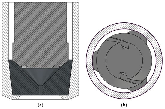 The SK nozzle utilized in this study is shown in Figure 1a. The nozzle is composed of two internal pieces that fit into the outer casing. The top piece has a head with two angled indentations that form the two inlet ports. These two inlet ports can be seen in the bottom view shown in Figure 1b. It can also be seen that the piece has a triangular shaft that fits precisely into the casing (the shaded white ring). This means that there are three slots between the top piece and the casing, which can be seen in Figure 1b as the white spaces between the dark grey and the white pieces. When liquid is pumped into the atomizer, it flows through these three slots and into the two inlet ports. The liquid then continues to the swirl chamber and the outlet channel of the bottom piece, which has an inner funnel shape.