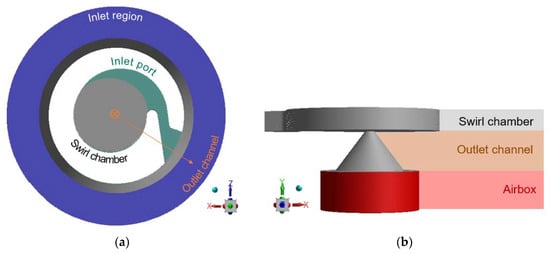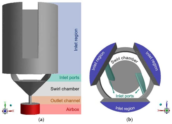 Gravity was set in the direction of the outlet (the y-direction in Figure 4 and Figure 5b). For the initialization of the simulation, the swirl chamber, outlet channel, and airbox were filled with air, and the inlet port(s) and the inlet region were filled with liquid. An adaptive multiphase-specific time step was used to ensure that the global Courant number was maintained below 1. The method monitors, across all cells in the mesh, the minimum ratio between the respective cell volume and the total outgoing volume flux. This minimum ratio is used as the next time step. It should be noted, however, that ANSYS, Inc. [13] mentions that local Courant values of up to five can be managed by the solver without significantly affecting convergence.