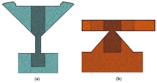 The aim of the study was to understand the two-phase flow in the nozzle. The interesting sections for this purpose are downstream from the inlet ports: the swirl chamber, outlet channel, and airbox. To save calculation efforts, only these sections were meshed with a fine polyhedral grid (shown in Figure 6). The cell was also set to half of the reference size in the region near the outlet of the nozzles (see the center darker regions in Figure 6), given that the narrowest section in both nozzles is there. The grid was created in two steps. First, a tetrahedral mesh was established using the patch-conforming method from ANSYS. Then, the mesh was converted to a polyhedral mesh in Fluent, by fusing the tetrahedral cells. Figure 6 shows the final mesh obtained for the two geometries. It should be noted that thin prismatic cells were generated near the wall all around the geometry to better approximate the boundary layer [22].