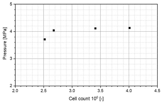 Figure 7 shows how the first convergence criterion, pressure, changes with the mesh size, which we characterized in the figure with the number of cells in the entire mesh. As expected, the predicted pressure converges to a stable value as the number of cells increases. From mesh M2 onwards, the variation of the predicted value with the cell number is already below 2%.