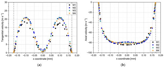 (a) Tangential and (b) axial velocity profiles across the outlet of the SK nozzle, when simulated at QL = 0.35 L/min with the emulsion of 10 mPa·s. The profiles are shown for four different meshes of increasing size (M1–M4). The radius of the nozzle outlet is indicated as the two vertical dashed lines.