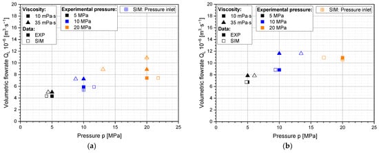 Additionally, we evaluated some alternative cases with “pressure inlets”, i.e., with a fixed inlet pressure instead of a fixed volume flow, to see if the different boundary condition reduces the numerical error. The three alternative cases are shown in Figure 10 as empty, crossed-out measurement points. In all three cases, the relative error was reduced when the pressure inlet was used instead of the mass flow inlet. For the SK, the 35% error that was initially observed in the pressure prediction (with 35 mPa·s and 20 MPa) was reduced to a 20% difference in the volume flow. For the MiniSDX, the relative error was reduced from 15% to 3%.