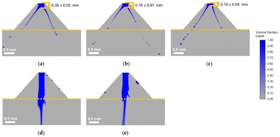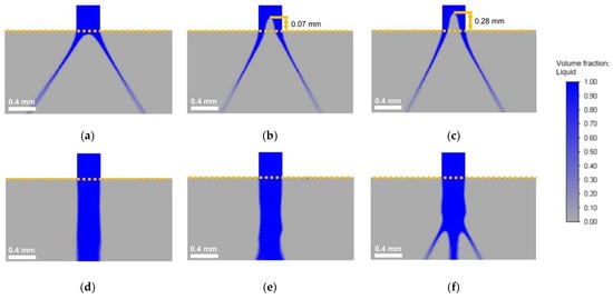 Instantaneous liquid fraction profile of the spray cone during simulation of the SK nozzle. (a–c) Correspond to µ = 10 mPa·s: (a) pexp = 5 MPa; (b) pexp = 10 MPa; and (c) pexp = 20 MPa. (d–f) Correspond to µ = 35 mPa·s: (d) pexp = 5 MPa; (e) pexp = 10 MPa; and (f) pexp = 20 MPa. For more information about operating conditions, refer to Table 3.
