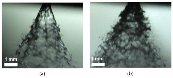 The measurement of spray angles was executed in a separate experimental run. The same operating conditions were recreated, but MD solutions without any oil content were used. Because of the low oil concentration in the original emulsions, we considered that the use of MD solutions would not significantly affect the results of the spray cone formation and its angle. The density and viscosity of the solutions were measured and proved to have the same values as the ones shown in Table 1.