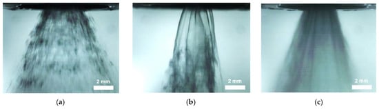 It should be noted that the profiles shown in the figure remained stable with time, so the lack of a spray cone should not be associated with insufficient computing time. Moreover, if one looks at the jet profiles (Figure 11d–f), it is also evident that the turbulence in the liquid jet increases with operating pressure. In fact, at 20 MPa, the jet already begins to break apart within the 1.2 mm length of the simulated airbox. Looking more specifically at the simulated spray profiles with 35 mPa·s in Figure 11, they seem to suggest that the liquid exits the nozzle as a short jet that breaks up into a twisting thin lamella, which quickly forms the spray cone. The length of this jet would decrease with pressure, which is why its breakup could already be observed for 20 MPa. To provide a better perspective, 3D reconstructions of the spray profiles with 35 mPa·s are shown in Figure A1.