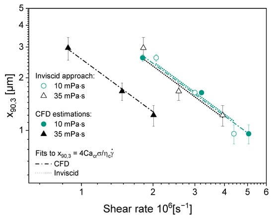 Values of x90,3 of oil droplet size after atomization with the SK nozzle, for two evaluated viscosities, correlated with the estimated shear rate with the inviscid approach (from Taboada et al. [9]) and with the shear rates determined from the CFD model.