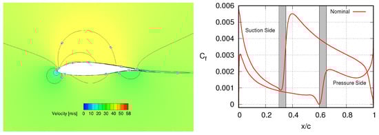 Case I: (Left) Velocity magnitude field around the airfoil computed using the nominal values of all model constants. (Right) Skin friction coefficient () distribution along the airfoil contour as computed using the CFD tool. The vertical zones in grey represent ranges of the measured [] transition points on both airfoil sides.