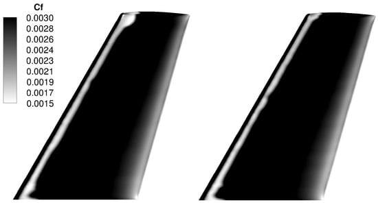 Case II addresses the flow around the ONERA M6 wing at , , zero angle of attack and zero yaw angle, and surface roughness m []. The transition model with crossflow effects is used as the CFD tool. The skin friction coefficient () field on the wing surface computed using the nominal values of the transition model is presented in Figure 3. White areas indicate the first part of each side of the wing surface along which the flow remains laminar.