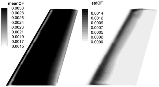 Figure 4 and Figure 5 present the statistical moments of computed using the gPCE-RBF method. The mean value plot on the surface shows a close similarity with the plot produced with the nominal values (Figure 3). Regarding the standard deviation of , high values (dark area) appear close to the leading edge and this is a clear indication that these uncertainties affect a small area around the location of transition in Figure 3. In Figure 4 and Figure 5, one may see a narrow whitish zone, very close to the leading edge, which corresponds to the very first part of the wing where the flow is not affected in any case.