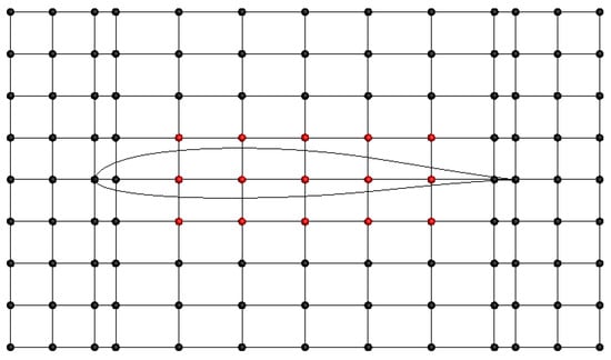 The third case addresses the flow around the S8052 isolated airfoil. The flow conditions are as follows: , , and and the simulation uses the transition model using the nominal values of the model constants, as seen in Section 2.1. Herein, two shape optimization problems, without and with geometric uncertainties, are considered. Geometric uncertainties are introduced using the KL expansion method. The RBF network is used as a surrogate to the CFD tool in order to approximate the QoI required for the computation of the statistical moments. The airfoil shape is parameterized using a NURBS control lattice, as seen in Figure 6. Control points marked in red are allowed to be displaced in the normal-to-the chord direction, giving rise to design variables in total. For the case with geometric uncertainties, uncertain variables resulting from the KL expansion (see Equation (11)) are considered.