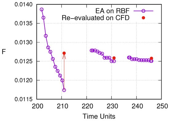 Case III: Convergence history of the shape optimization run relying on the RBF-based surrogate (purple line with empty circles) with re-evaluation on the CFD tool (filled red circles). The vertical axis values indicate either the RBF-based predictions (for the EA convergence histories; purple lines) or the objective function values computed by the CFD tool for the re-evaluated solutions. The horizontal axis starts after the first 201 time units to include the cost for evaluating the training patterns (200 CFD runs, i.e., 200 time units) and training the RBF (1 time unit).