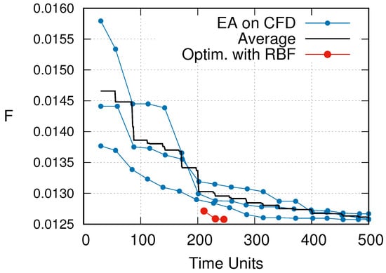 To quantify the gain from the use of the RBF-based surrogate, the optimization problem is additionally solved using an EA relying exclusively on the CFD tool. Since we are dealing with a stochastic optimization method, three runs are performed using different random number generator seeds. A termination criterion of 500 CFD evaluations (500 time units) is set and the corresponding convergence histories as well as the average of the three runs are shown in Figure 8. The best solutions of the three cycles of the run on the RBF-based surrogate, after being re-evaluated on the CFD tool, are also included. It can be seen that, with the RBF-based surrogate, one may obtain a solution of, practically, the same quality (almost the same objective function value) at a significantly lower computational cost.