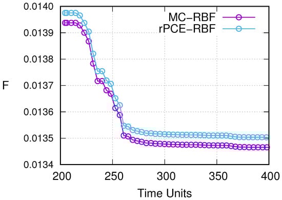 Given the above, the RBF network predictions can safely be used in UQ. In this case, comparison among all UQ methods of Section 2.5, using the RBF network, is carried out. In what follows, MC-RBF, gPCE-RBF and rPCE-RBF stand for a UQ using the MC, gPCE and rPCE methods, respectively, all of them based exclusively on the RBF model. For the MC, samples are generated at random. The gPCE used the 81 GQ points and the rPCE used either the 81 GQ points or the 150 samples generated using the LHS.