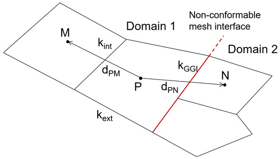 Cell P had a set of faces k, including internal faces kint, external faces kext, and adjacent faces kGGI of the two domains, which formed a non-conformable mesh interface. Cell M and cell P belonged to one and the same domain (Domain 1), while cell N belonged to the neighboring domain (Domain 2); the distances from the center of cell P to the centers of cells M and N were dPM and dPN, respectively. Consider the equation discretization by the example of Equation (13); it was based on the method of finite volumes with respect to the unstructured nature of the computational mesh. The time discretization of Equation (13) was performed using one of the known schemes; here, we used the implicit Euler scheme [45]: