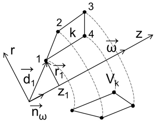 Alternatively, the flux can be found exactly in the calculation of the volume created by sweeping with a rotating face. Figure 3 shows the face k with vertices 1-2-3-4 and the volume Vk created by rotating this face about axis ω.