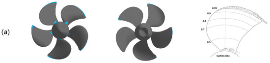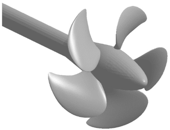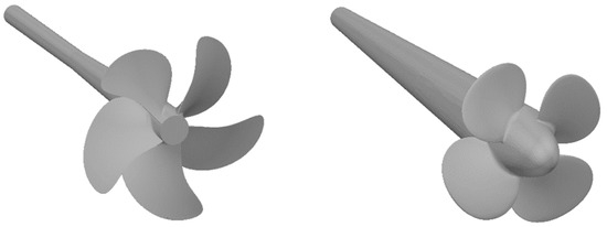 First, the method is verified on the problems of a homogeneous liquid flow around propellers KP505 and IB without consideration of cavitation. The propellers are fixed at the shaft end, the KP505 model diameter is 0.25 m, and the IB model diameter is 0.2 m. Figure 4 shows the geometry of these propellers.