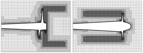 The computational meshes in Figure 5 were generated with a higher concentration of cells near blades, in the swirling flow motion direction, and in the boundary layer. The KP505 model mesh contains 15 mln cells, and the IB model mesh contains 5.8 mln cells. The computational meshes consist of two regions: the rotating internal region and the stationary external one. Both regions are cylinders; the propeller fixed at the shaft end is inside the rotating region.