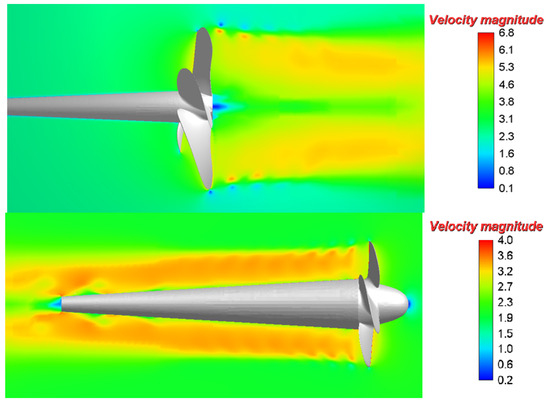 One can see from Figure 6 the swirling flow and the velocity magnitude distribution near the propeller.
