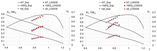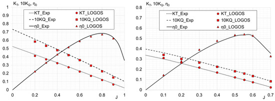 Figure 7 shows the action curves for KP505 and IB propellers obtained using the LOGOS software package in comparison with experimental data [51,52].