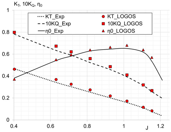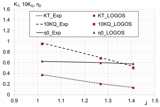 Figure 12 shows, in comparison, the performance curves of VP1304 propeller obtained using LOGOS and experimental data [53].
