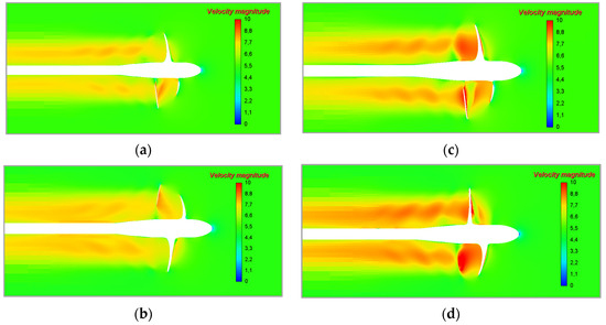 Then, computations are carried out for the cavitation flow conditions. Figure 16 shows the velocity magnitude distribution in the central section of the computational domain for different rotation speeds of the propeller and different cavitation numbers.