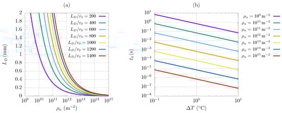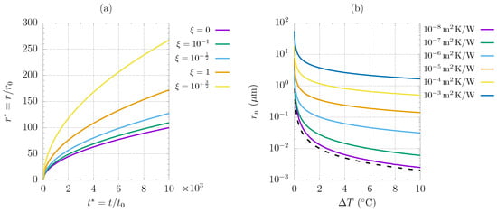 Non-dimensional droplet growth model, Equation (7), at different values of the coating parameter and fixed (a). Nucleating radius as a function of subcooling and coating thermal resistance ; , water properties evaluated at (b). The dotted line represents the critical nucleating radius, Equation (11).