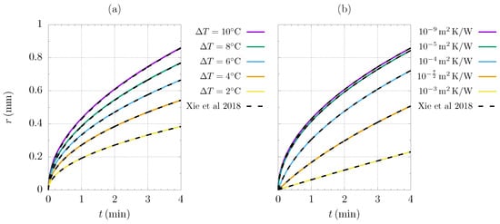 Droplet radius versus time at different substrate subcooling , fixed (a), at different coating thermal resistances , fixed (b). , water properties evaluated at . The continuous lines represent Equation (4) and the dotted lines are obtained via numerical integration of the droplet growth model by ref. [].