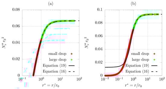 meaning that the non-dimensional parameter does not depend on the liquid properties or on the substrate subcooling and contact angle. We further assume that is consistent with the model of ref. [] in case of negligible coating thermal resistance. As expected, the cumulative size distribution of the large droplet population agrees with the empirical correlation of ref. [], see Figure 5. The computed, cumulative size distribution of small drops also agrees with the theoretical correlation of ref. [] in case of , while it is lower than the theoretical size distribution for low droplet radius in case of . However, Equation (18) is not reliable in the limit of small as infinite droplet density is predicted when the droplet radius approaches the critical nucleating radius, .