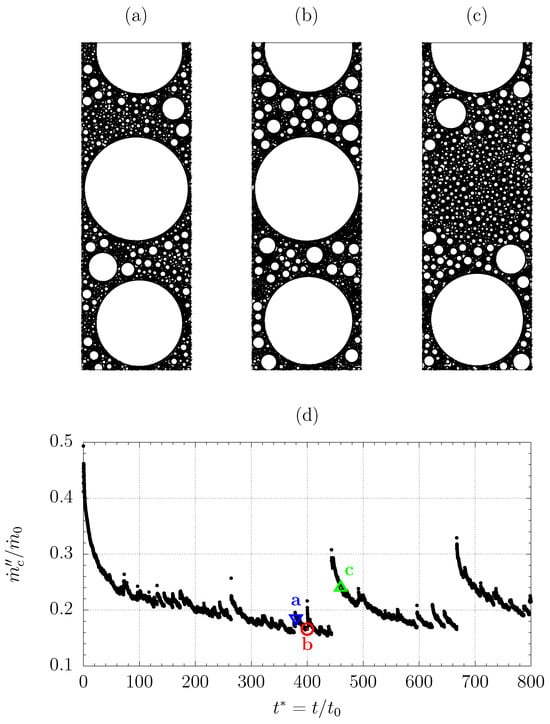 The experimental setup of Peng et al. [] was replicated. Thus, condensation of water vapor at a saturation temperature of (fluid properties listed in Table 1) over a circular, vertical test section of radius , characterized by alternating hydrophilic–hydrophobic vertical stripes of width and was considered, as shown in Figure 3. In particular, condensation over a stripe of hydrophobic surface of non-dimensional width (white regions in Figure 3) was simulated: periodic conditions were applied through , while the presence of hydrophilic regions at and was implemented as described in Section 2.4. It was assumed that the solution of a localized piece of hydrophobic strip is representative of the whole hydrophobic surface, in terms of specific heat flux and migrating flow rate per unit length. The computational domain height was set to to ensure statistically relevant results. Peng et al. [] did not provide specific information about the thickness and the thermal conductivity of the self-assembled monolayers (SAM) deposited on the solid substrate to ensure hydrophobicity. We considered in the numerical simulations: such an assumption is consistent with SAMs, characterized by low thermal resistance, of the order of []. Computations were run at different normalized width , while the static contact angle was set to , according to ref. []. Once the solution becomes self-similar, the computations were stopped and the non-dimensional heat flux from dropwise condensation (DWC) contribution was estimated from the cumulative condensate volume, which was traced during the whole computation. Furthermore, the volume of liquid migrating through the hydrophobic–hydrophilic boundary due to capillary forces was also traced. As shown in Figure 3, droplets with the base surface touching the hydrophilic stripes instantaneously migrate and merge with the thin film flowing over the hydrophilic side. Snapshots of the droplet population resulting in successive instants from a computation at with time integration step of are shown in Figure 6a–c. The actual condensing flux is shown in Figure 6d, where it can be observed that, after the largest droplet, with a base diameter of about half , migrates to the hydrophilic region, suddenly increases due to nucleation and growth of several droplets over the dry spot left by the migrating droplet. In fact, droplet growth is faster during the very first stage, as , see Equation (7). Thus, a small hydrophobic region ensures an higher sweeping frequency and smaller droplets size, with a benefit in terms of DWC heat flux. On the other hand, reducing the hydrophobic width means that the contribution from FWC, which is about one order of magnitude lower in terms of specific heat flux, becomes more important. The self-similar condition is reached when the sweeping cycles of the largest droplets (characterized by ) are observed and, thus, the computed averaged condensing flux stabilizes.