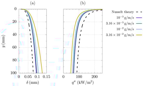 Equation (29) has one positive root . Following the experimental setup of ref. [], let us consider water properties at saturation temperature of , substrate subcooling , and hydrophilic width . The corresponding rivulet height along the vertical plate is plotted in Figure 8a at a different flow rate per unit length , migrating from the hydrophobic to the hydrophilic region, and compared with the film thickness from Nusselt theory []. The heat flux along the vertical coordinate is also plotted in Figure 8b, showing that the standard Nusselt theory [] would lead to inaccurate results. The heat flux through a vertical, hydrophilic strip can be simply estimated as , with being the condensate flow rate at the outlet section. As the condensing surface of [] is a circular plate of radius R, characterized by vertical hydrophilic-hydrophobic stripes, the specific heat flux through the whole hydrophilic surface was evaluated as: