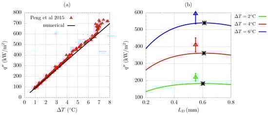 The estimated nucleation density was then used in the optimization of the hybrid surface geometry, in order to validate the model with the experimental data of ref. [] at different hybrid surface geometries, not yet used for characterization of and therefore representing different test cases to investigate. In particular, the effect of increasing the hydrophobic width at fixed was investigated. Numerical data at different values of were used to trace the DWC heat flux as a function of the hydrophobic width and substrate subcooling. To do so, further computations at were run and the available heat flux data were interpolated. The resulting specific heat flux of the hybrid surface is shown as a function of in Figure 9b, at different substrate subcoolings. A maximum of is always observed at . The experimental optimum observed by Peng et al. [] is also identified with markers in Figure 9b, showing a good agreement with numerical data. Furthermore, the predicted heat flux falls inside the uncertainty range of experimental data for .