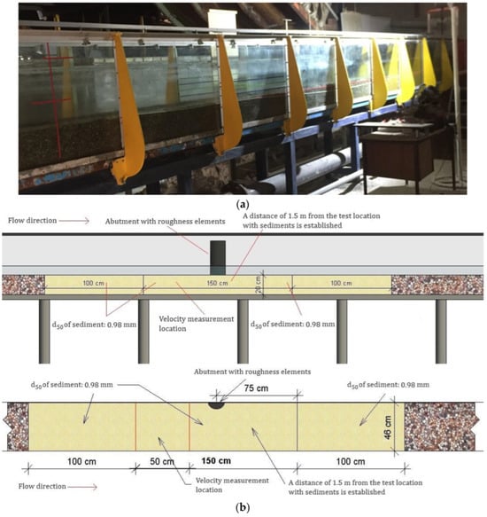 (a) The laboratory flume, and (b) the experiment area’s plan view.