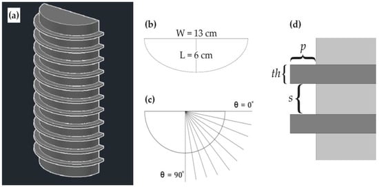 (a) 3-D view of the abutment with roughness elements; (b) Abutment dimensions; (c) Angle range of measuring the depth and slope of the scour hole in the experiments; (d) Roughness elements on the abutment, and their protrusion (p), thickness (th), and spacing (s).