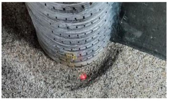 Upon commencing the tests, a noticeable scour hole rapidly formed around the abutment, as depicted in Figure 4. This indicates the occurrence of primary vortices downstream. Laboratory observations suggest that the intensity of scour development at a depth of 9 cm is lower compared to depths of 12 cm and 15 cm. This aligns with the experimental findings reported by other researchers [,,,,], which indicate that the maximum scour depth increases with an increase in the depth of the approaching flow. Consequently, it is expected that the scour of the abutment’s sides will be less pronounced at a depth of 9 cm compared to depths of 12 cm and 15 cm. During the initial stages of scour, the expansion and deepening of the scour hole around the abutment are more prominent []. The authors utilized a one-dimensional current meter that could not capture turbulence data. In another study, we employed an Acoustic Doppler Velocimeter (ADV) and encountered limitations in capturing relevant data due to reduced spacing in skimming flow conditions. The intention to adopt Particle Image Velocimetry (PIV) is driven by the desire to conduct a more extensive investigation, aiming to reveal the intricate flow patterns around the abutment.
