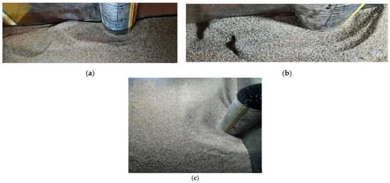 Scour pit at the end of the experiment, for the following flow depths: (a) h = 15 cm, (b) h = 12 cm, and, (c) h = 9 cm.
