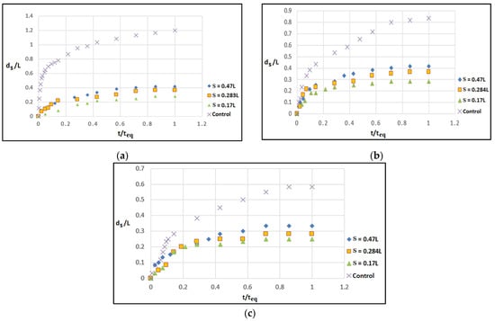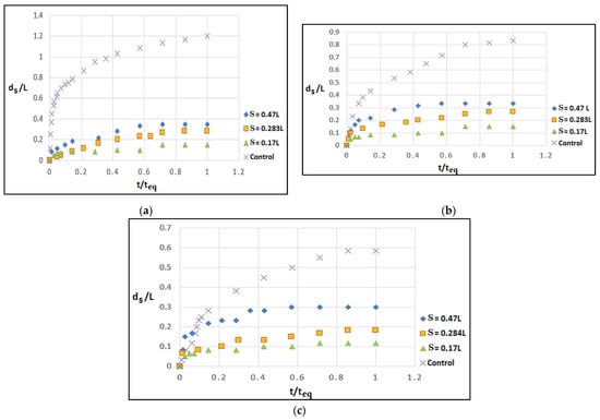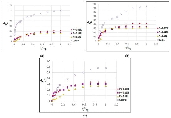The effect of the spacing between the roughness elements on the temporal development of the local scour depth (p/L = 0.117); (a) h = 15 cm, (b) h = 12 cm, (c) h = 9 cm.